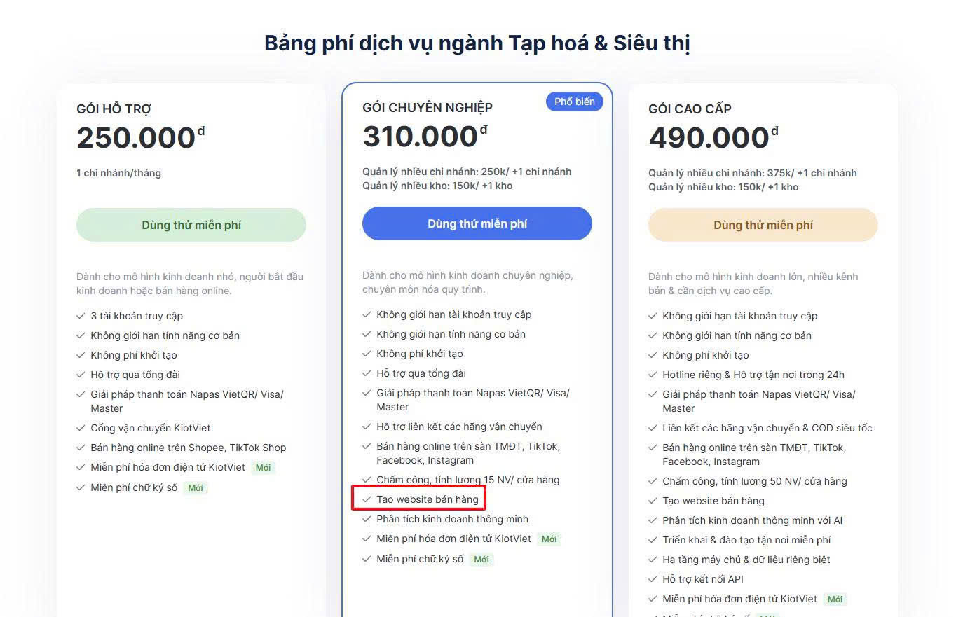Các bạn hãy nhìn kỹ tính năng công bố của KiotViet, và so sánh với các đơn vị khác: Sapo, Haravan ...